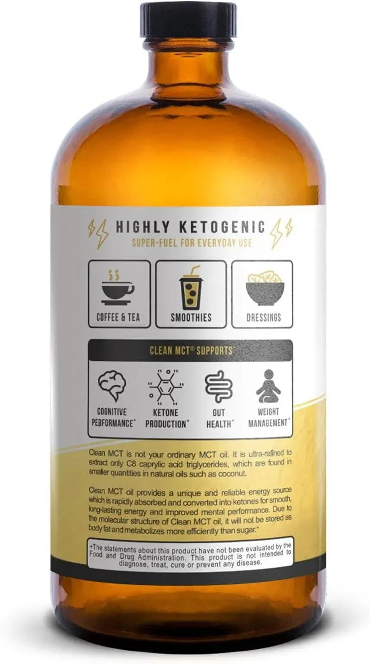 • Clean MCT Oil puede brindar un impulso muy necesario a sus esfuerzos de salud, ya que las investigaciones indican que los MCT pueden contribuir a un aumento del metabolismo y una disminución del apetito, lo que en última instancia conduce a mejores resultados durante un período prolongado. Al usarlo como sustituto de otros aceites o grasas al cocinar y hornear, puede comenzar a experimentar resultados positivos en su estilo de vida optimizado.