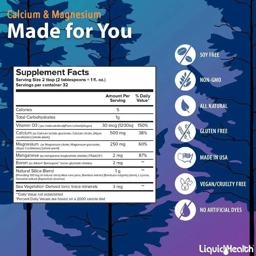 NUTRIENTES ESENCIALES PARA LOS HUESOS Y LA SALUD: Liquid Health Calcio y Magnesio proporciona las vitaminas esenciales que necesita para huesos fuertes y saludables y soporte de tejido conectivo.