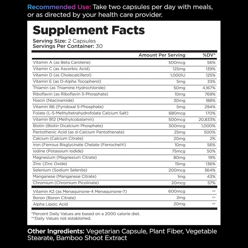 Nutrición completa: nuestros suplementos combinados de vitaminas y minerales contienen cantidades óptimas de muchos nutrientes para COMPLETAR CUALQUIER BRECHA NUTRICIONAL en la mayoría de las dietas y para proporcionar una base sólida de multivitaminas/multiminerales. ¡Ideal para personas de 40, 50, 60 años y más!