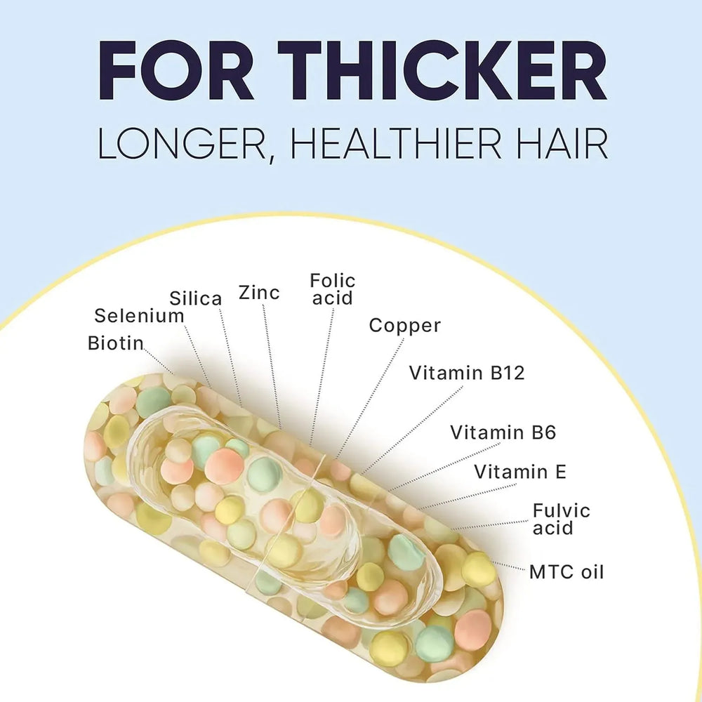 CRECIMIENTO DEL CABELLO MÁS GRUESO, MÁS LARGO: este suplemento para el cabello está repleto de nutrientes para el crecimiento del cabello e incluye todo lo necesario para el crecimiento del cabello. Con el uso regular, notarás una diferencia en el grosor y largo de tu cabello.
