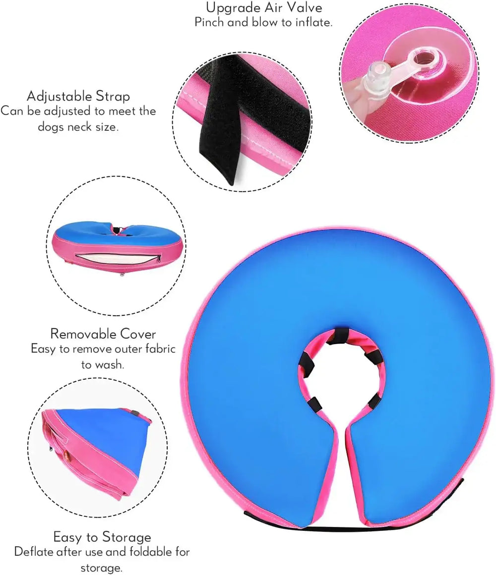 Collar inflable tipo cono para perros: Este collar inflable tipo dona es la alternativa perfecta al cono para el cuello después de una cirugía. Este cono suave evita que las mascotas se laman heridas, suturas, especialmente erupciones o después de una cirugía, y permite que su mascota coma, beba y duerma con normalidad, lo que favorece su recuperación. Su forma única y adorable lo convierte en un adorno para mascotas en lugar de un collar quirúrgico. Su mascota estará mucho más feliz con él.