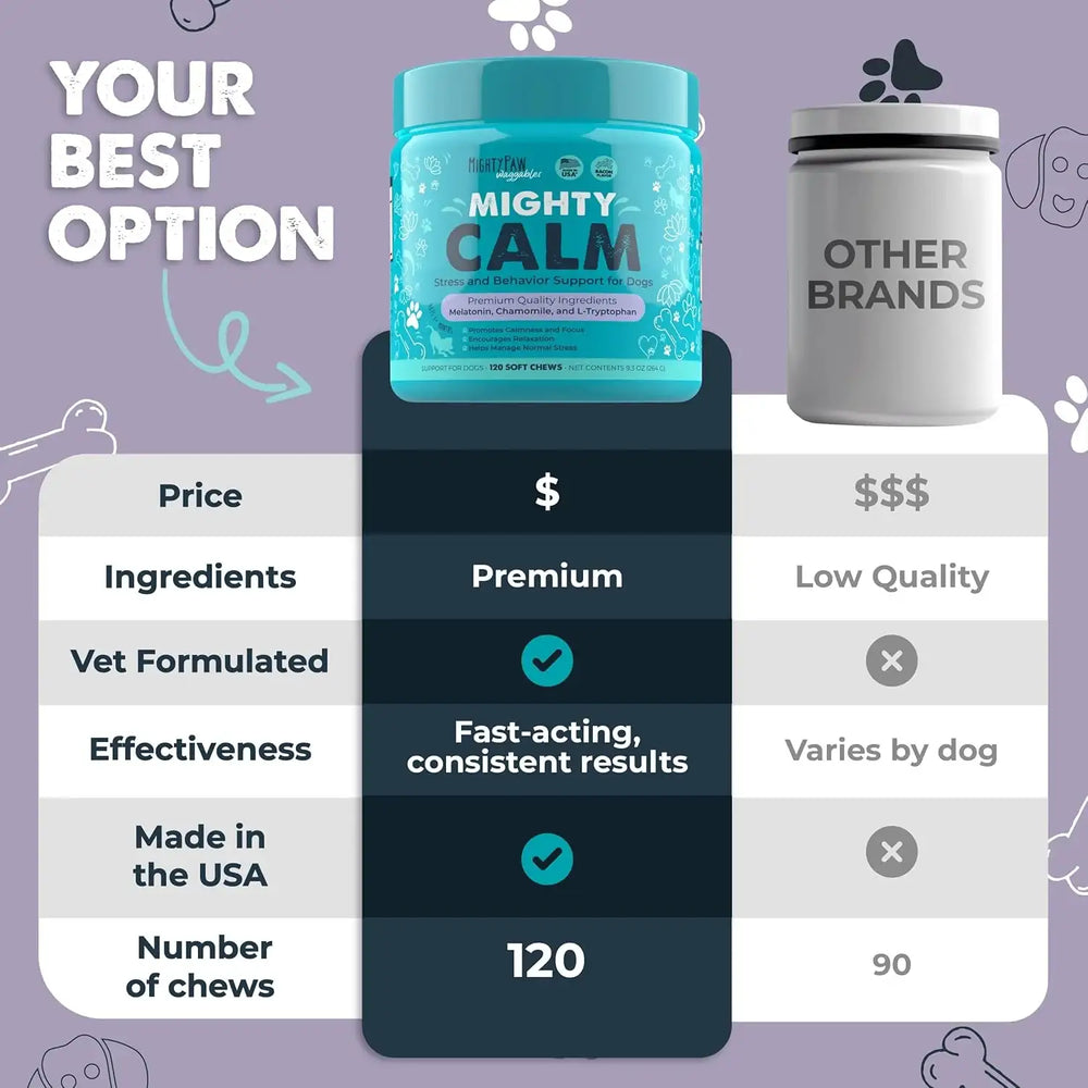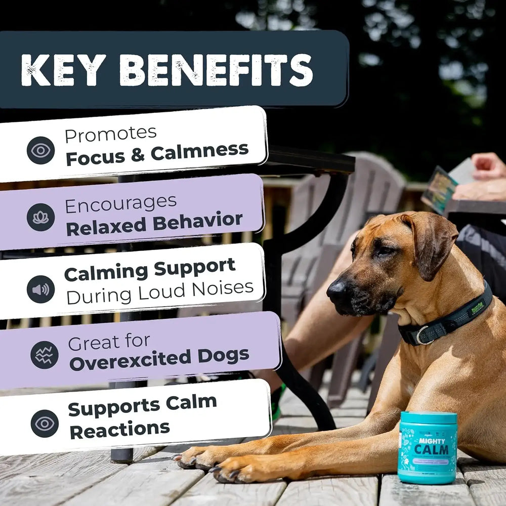 Ingredientes botánicos calmantes para aliviar el estrés: Repleto de melatonina, manzanilla y L-triptófano para promover la relajación y un comportamiento tranquilo, Mighty Calm es la opción ideal para ayudar a relajar a los perros que tienen dificultades con la separación, los viajes o los ruidos fuertes.