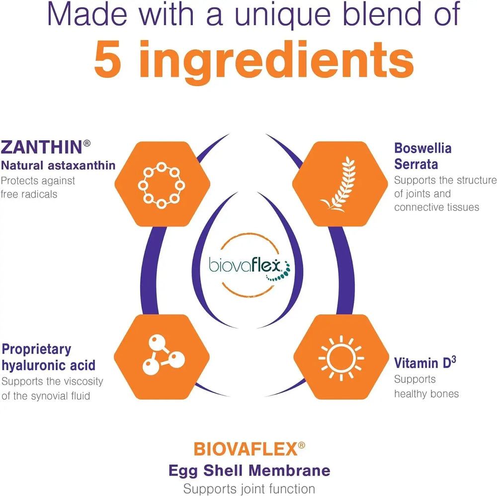 Ingredientes innovadores: Contiene la membrana de cáscara de huevo BIOVAFLEX para una flexibilidad articular inigualable, combinada con otros 4 potentes compuestos para ofrecer una alternativa a la glucosamina y la condroitina.