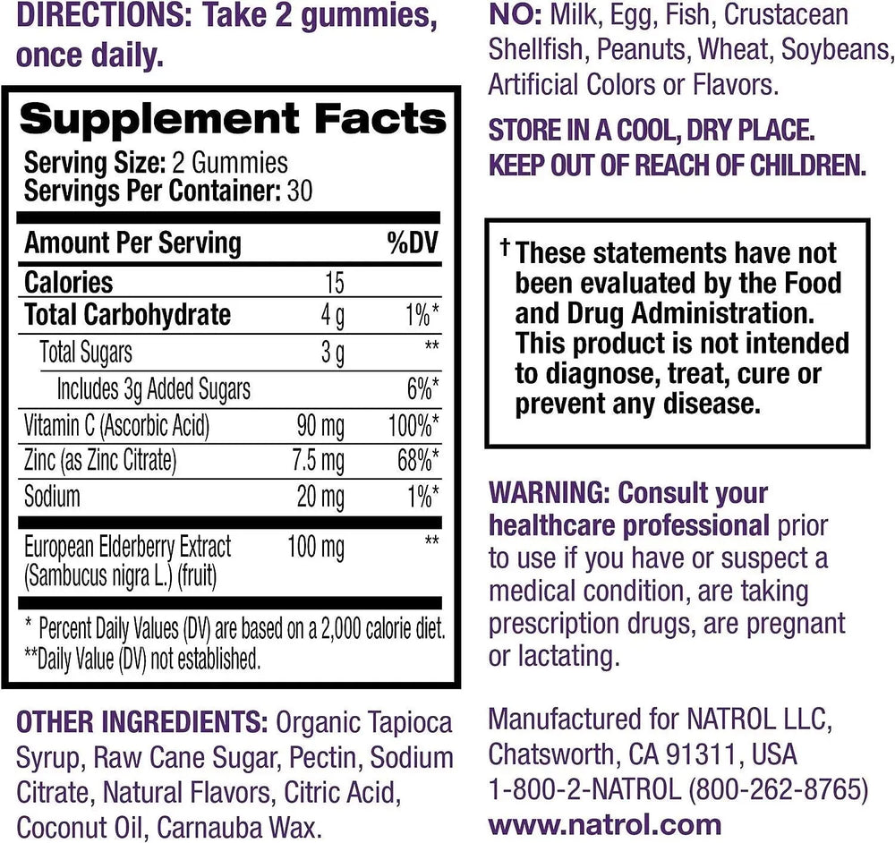 Las gomitas de saúco de Natrol son 100 por ciento libres de drogas, gluten, OGM, vegetarianas y no contienen saborizantes, edulcorantes ni conservantes artificiales.