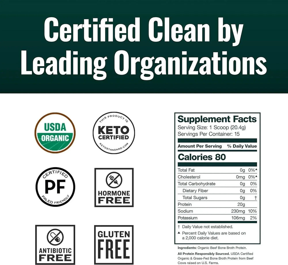 Alimentado con pasto. USDA Organic y Keto certificado: la proteína de caldo de huesos orgánico Natural Force se obtiene exclusivamente de carne de res orgánica USDA y alimentada con pasto, criada sin el uso de antibióticos, hormonas ni OGM. Esta fuente de proteína sin gluten y sin lácteos es saludable y conveniente, lo que la convierte en la proteína en polvo perfecta para dietas limpias Keto y Paleo.