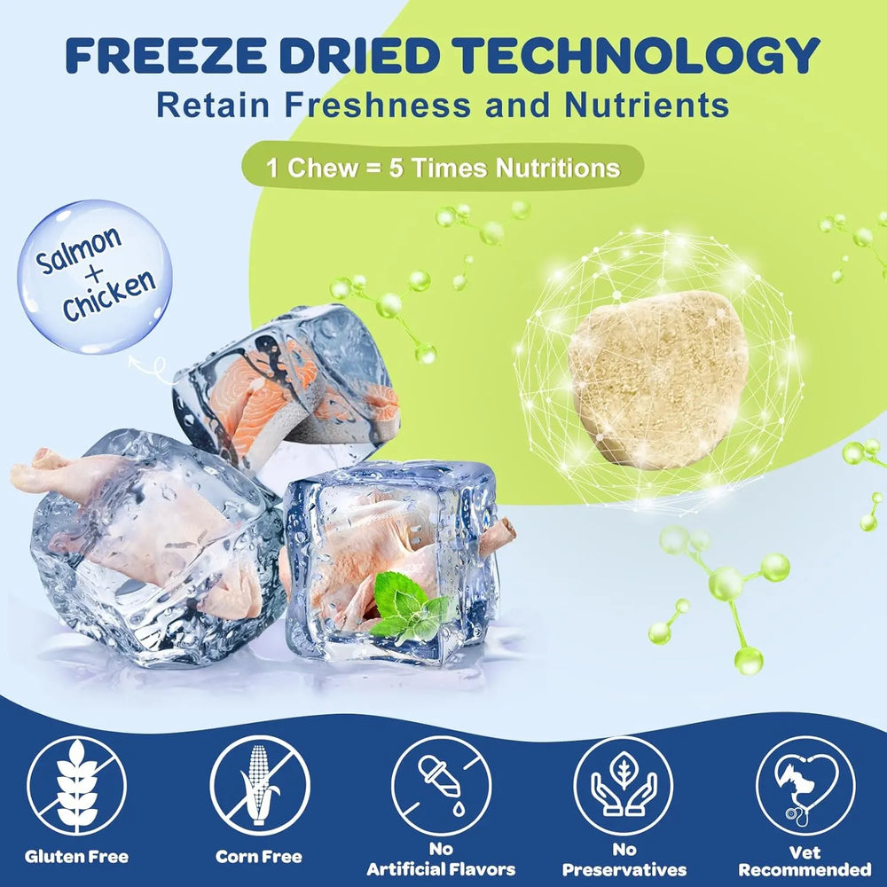 Fórmulas de alto nivel: Nature Target selecciona el aceite de salmón silvestre de Alaska para perros como la única fuente de ácidos grasos omega-3, omega-6 y omega-9 naturales. Contiene 520 mg de EPA y DHA por cada dos masticables, superando a otras marcas. 120 bocados en bolsa sellada al vacío y frasco estable. Su tecnología especial de liofilización minimiza el deterioro y maximiza la actividad y estabilidad de los ingredientes. Nuestro aceite de salmón para perros y gatos es nutritivo y delicioso, lo que garantiza que su perro espere con ansias su dosis diaria de nutrientes esenciales.