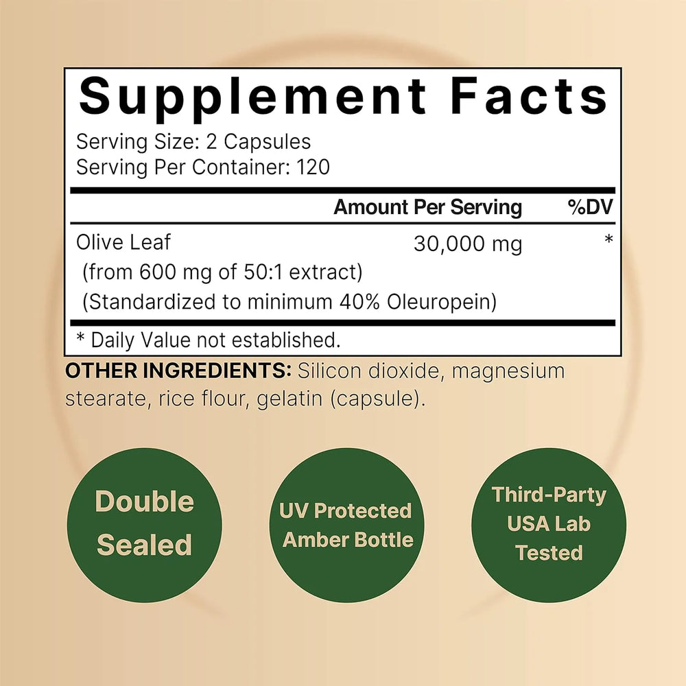 Cápsulas de hoja de olivo de máxima potencia de 30 000 mg, extracto altamente concentrado 50:1, estandarizado para retener un mínimo de 40 % de oleuropeína activa por porción.