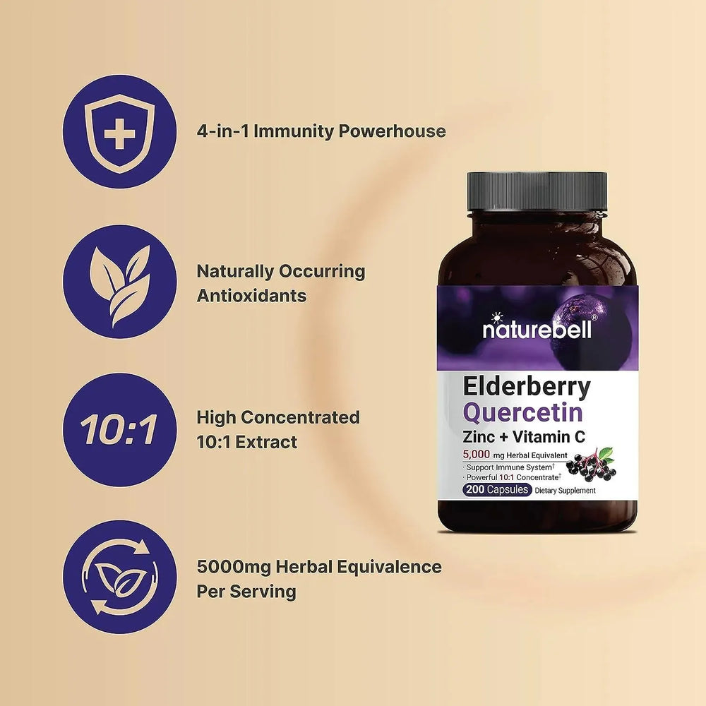 Suplemento de saúco Sambucus con quercetina, zinc y vitamina C, equivalente a hierbas de 5000 mg, 200 cápsulas, fórmula 4 en 1, suplementos premium de quercetina y zinc de saúco, sin OGM.