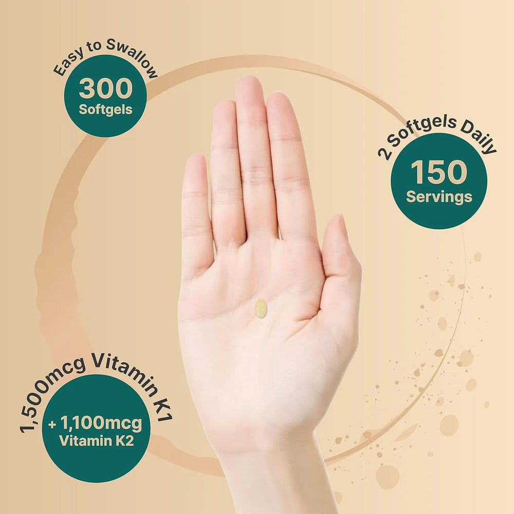 300 cápsulas blandas de aceite de coco (2 porciones) aportan 1500 mcg de K1 como fitonadiona, 1000 mcg de K2 como menatetrenona (MK4) y 100 mcg de menaquinona (MK7) por dosis; el suministro dura hasta 150 días.