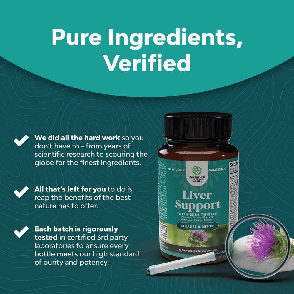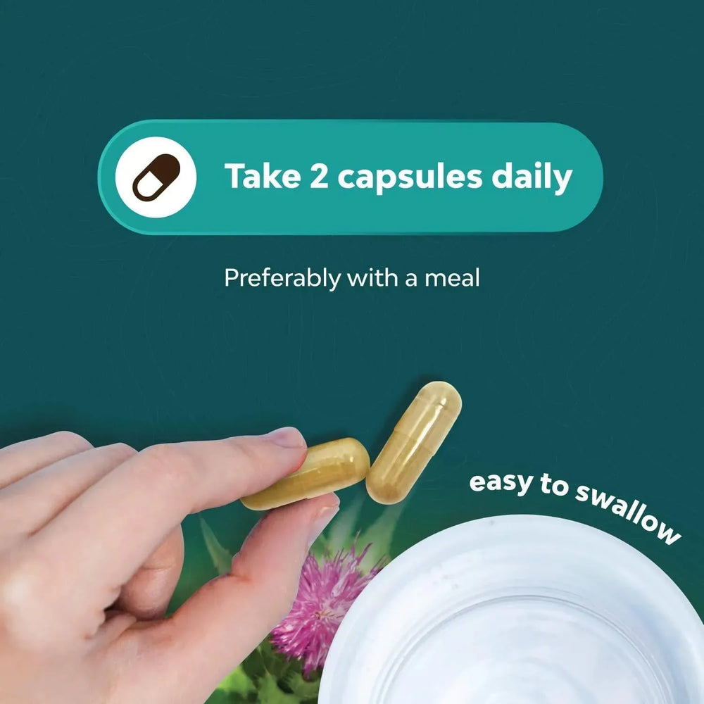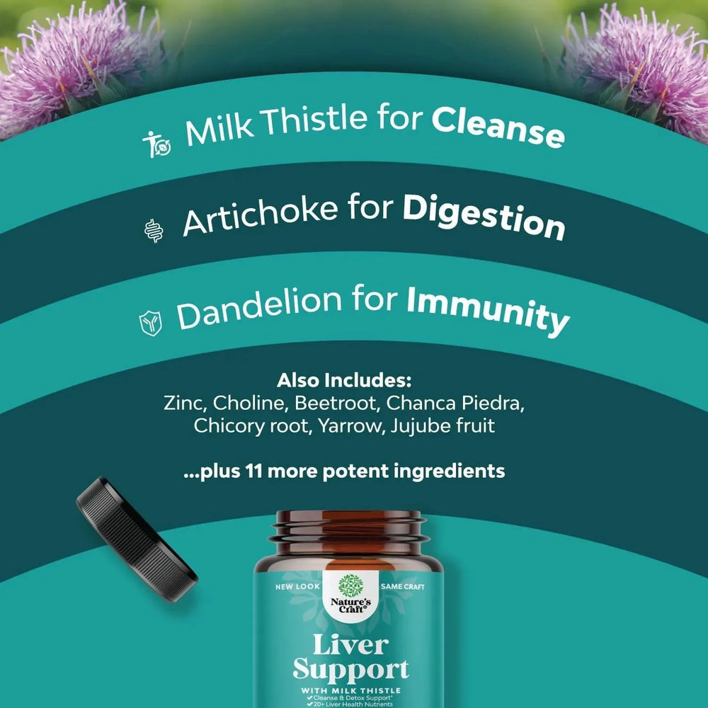 Cuidado avanzado del hígado: promueva un funcionamiento fuerte del hígado con nuestras cápsulas de extracto de cardo mariano enriquecidas con polvo de raíz de achicoria de milenrama, chanca piedra, berberina y más para una limpieza profunda del hígado.