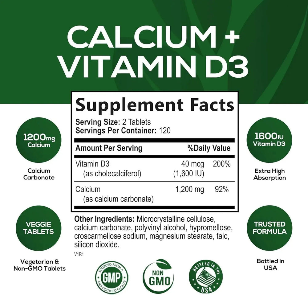 Ingredientes efectivos: apoya la fuerza ósea con 1200 mg de carbonato de calcio más 1600 UI de vitamina D3
