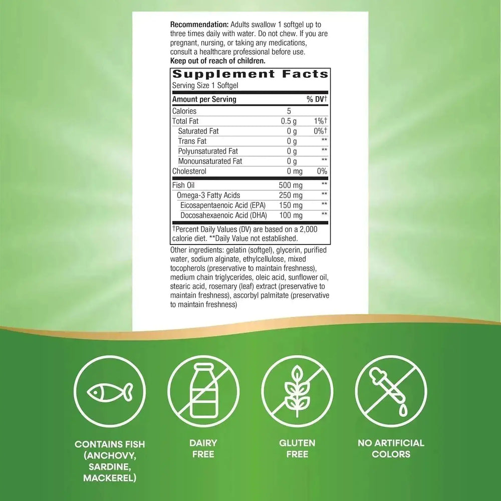 El aceite de pescado Fisol de Nature's Way favorece la salud cardiovascular y de las articulaciones. Contiene aceite de pescado puro y altamente concentrado con un 50 % de ácidos grasos esenciales omega-3, 250 mg por ración. (Consulte la información complementaria para conocer el contenido total de grasa).