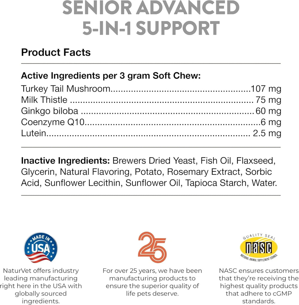 SUPLEMENTO IDEAL PARA LA SALUD CARDÍACA DE SU PERRO: Ayude a fomentar la actividad y la comodidad al alimentar a su compañero canino con este suplemento NaturVet Senior Advanced 5 en 1. Este suplemento para perros actúa para ayudar a fortalecer el sistema inmunitario y la salud ocular, cardíaca y hepática.