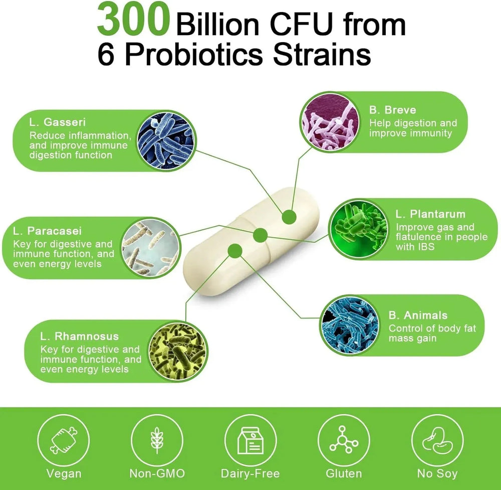 Mejor solución para la salud intestinal: cada 2 cápsulas que contienen 6 cepas probióticas específicas, 300 mil millones de probióticos Cfus, que trabajan juntos para restaurar y reponer su intestino, ayudan a aliviar los gases comunes ocasionales, la hinchazón y la indigestión.