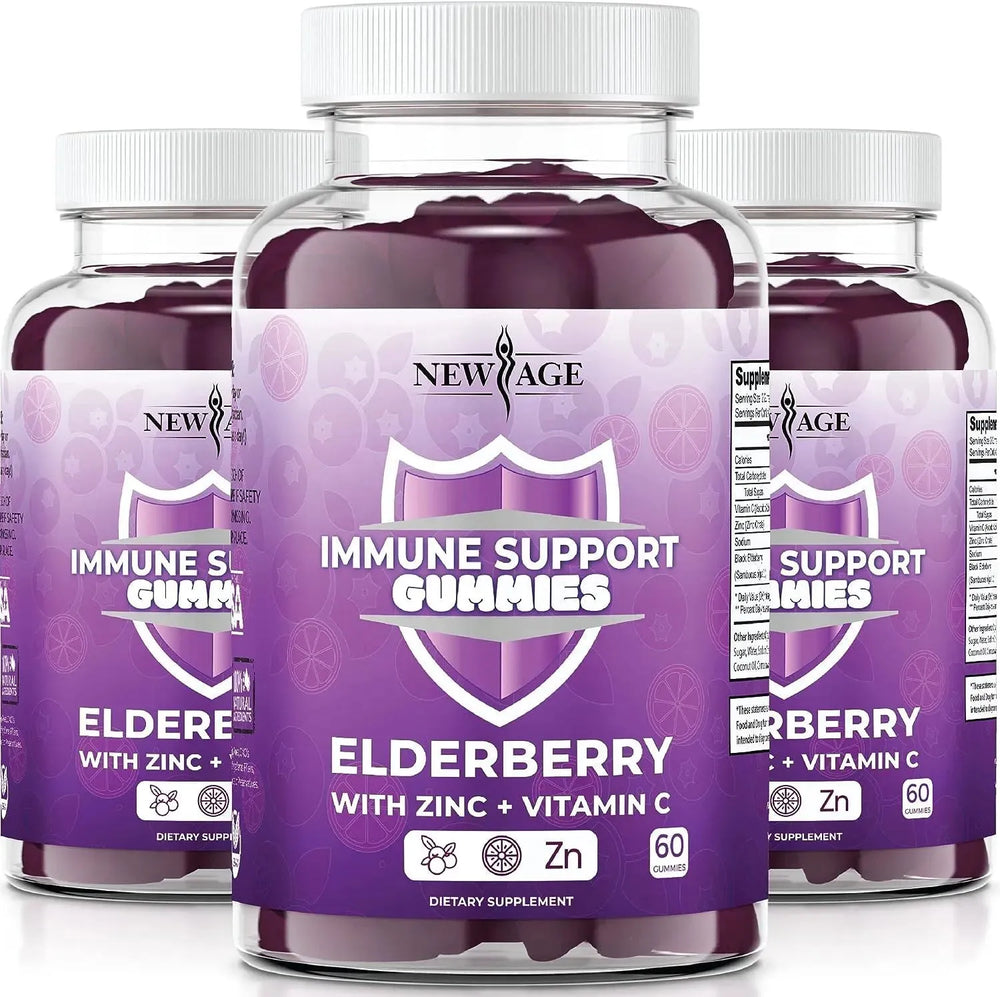Deliciosas gomitas de apoyo a la inmunidad: New Age combina saúco sambucus, un potente extracto antioxidante que ayuda a respaldar la salud del sistema inmunológico, con potenciadores de la inmunidad, vitamina C y zinc para crear tus gomitas de saúco 3 en 1 que estimulan la inmunidad.
