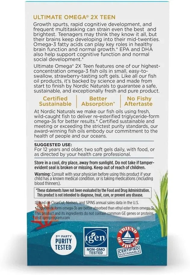 MEJOR ABSORCIÓN, MEJOR SABOR - Todos los aceites de pescado de Nordic Naturals están en forma de triglicéridos (la forma que se encuentra naturalmente en el pescado) para una absorción óptima. Ultimate Omega 2x Teen tiene un delicioso sabor a fresa.