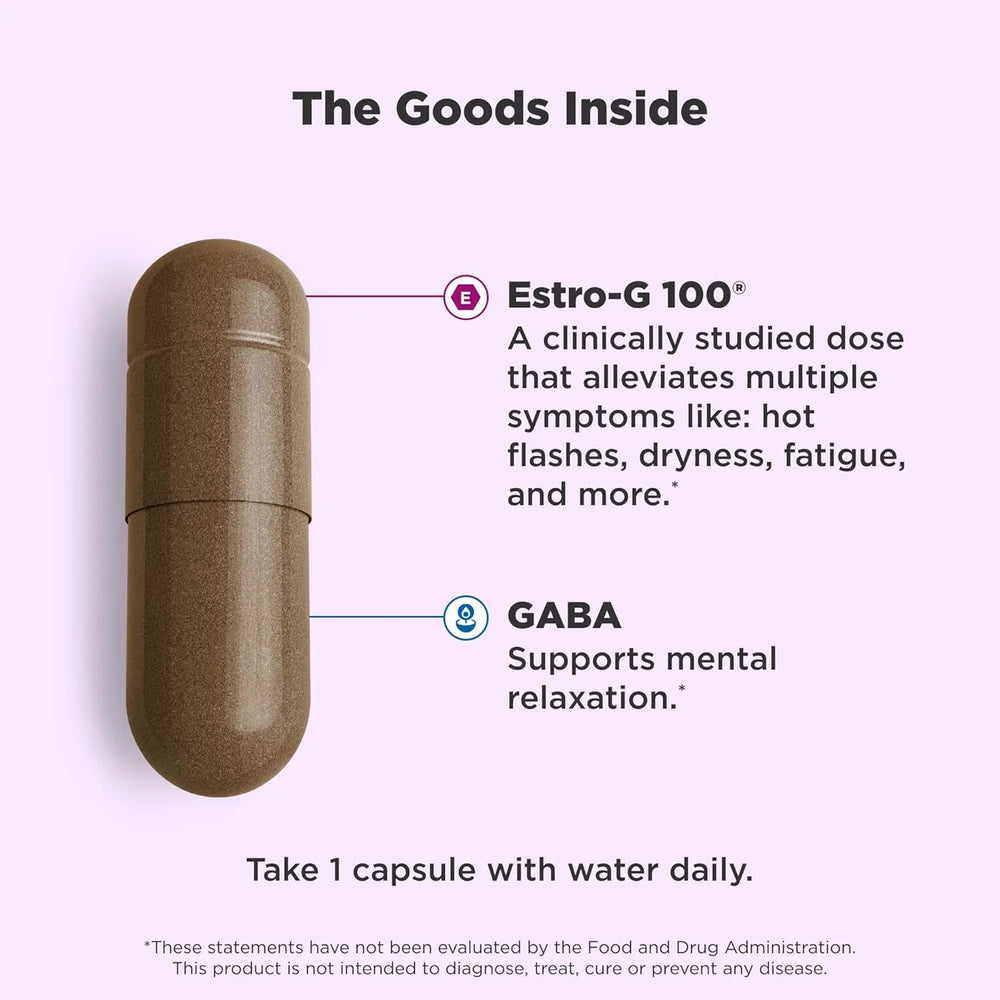 CONTENIDO: EstroG-100 clínicamente estudiado para ayudar a aliviar los síntomas de la menopausia, incluyendo sequedad vaginal, fatiga, sofocos, sudores nocturnos y dificultad para dormir, incluso cambios de humor ocasionales e irritabilidad.