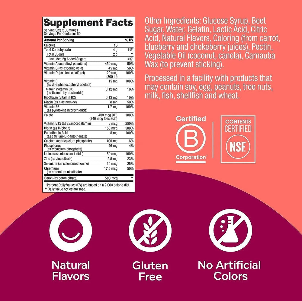 NATURALMENTE DELICIOSO: Estas vitaminas diarias masticables vienen en Blissful Berry con sabor natural, sin colorantes ni sabores artificiales y no contienen gluten. 120 gomitas por botella (suministro para 60 días)