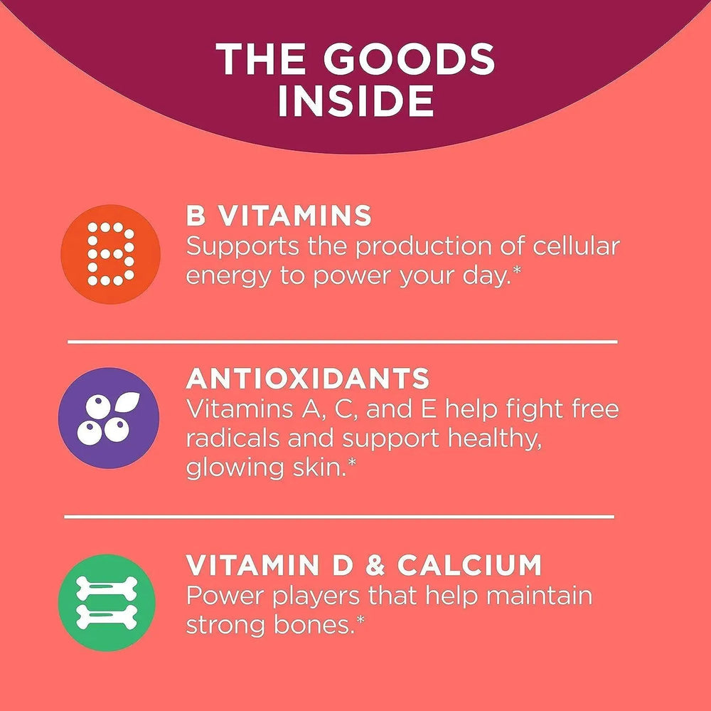 LOS PRODUCTOS INTERIORES: Este multivitamínico multitarea para mujeres contiene vitaminas B para apoyar la producción de energía, vitaminas A, C y E para ayudar a combatir los radicales libres y apoyar una piel sana y vitamina D y calcio para mantener huesos fuertes.