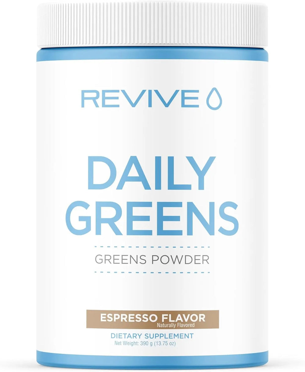 Absorba los nutrientes esenciales: Daily Greens de Revive le proporciona a su cuerpo una potente dosis de verduras ricas en nutrientes y ha sido formulado para aquellas personas con dietas bajas en frutas y verduras. Si su ingesta diaria de frutas y verduras es inferior a la cantidad recomendada, este suplemento es para usted. Sabor: Espresso. 13,75 oz, 30 porciones.