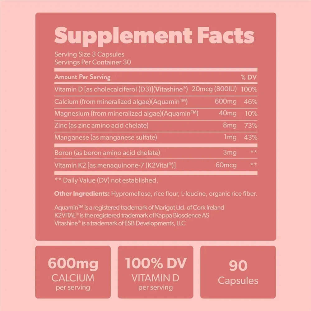 FÓRMULA TODO EN UNO: nuestro calcio vegano contiene 600 mg de calcio elemental de algas rojas de origen sostenible. Contiene vitamina K2 y D3, zinc, manganeso y boro.