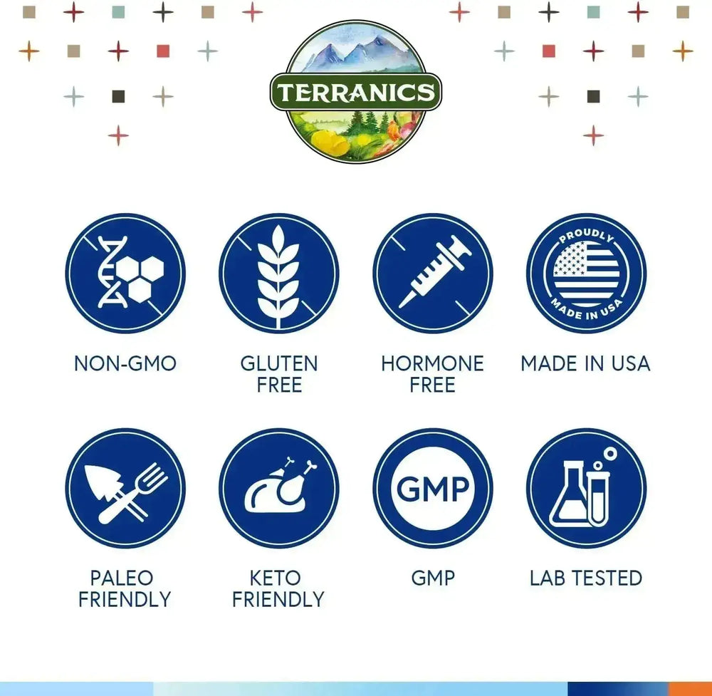 Fabricado con orgullo en EE. UU.: Terranics Multi Collagen Peptides Powder se fabrica en EE. UU. en instalaciones de última generación con certificación GMP y con los estándares más altos posibles. Cada colágeno es probado por terceros para comprobar su pureza, calidad y potencia.