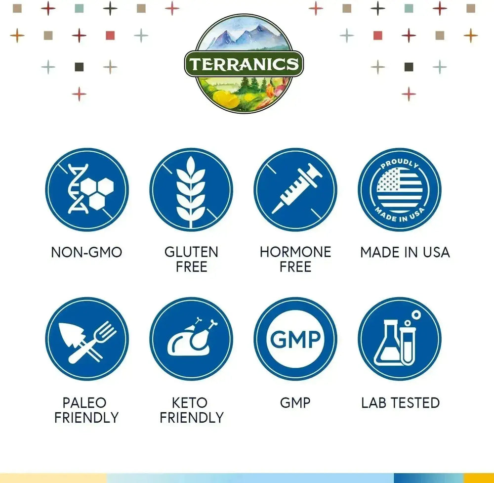 Fabricado con orgullo en EE. UU.: el polvo de péptidos de colágeno múltiple de Terranics se fabrica en EE. UU. en una instalación de última generación con certificación GMP bajo los estándares más altos posibles. Cada colágeno es probado por terceros para comprobar su pureza, calidad y potencia.