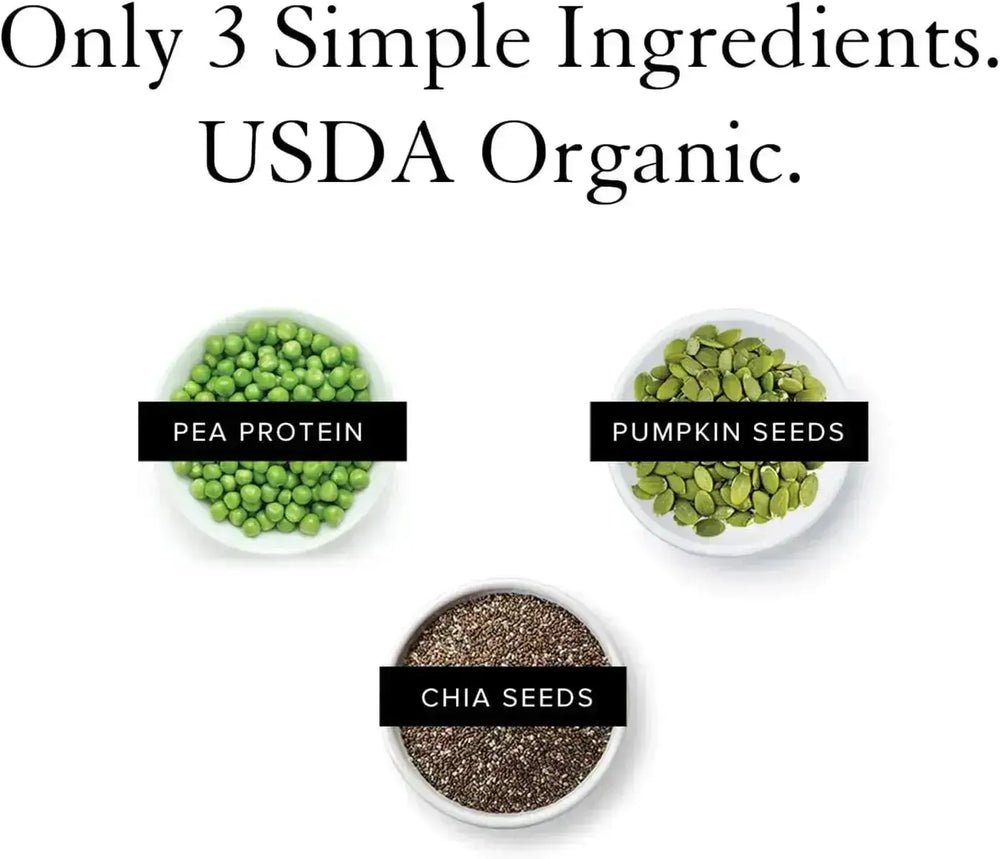 Certificado orgánico del USDA: confíe en la integridad de nuestro polvo de proteína vegano de origen vegetal, certificado orgánico del USDA, sin OGM y apto para veganos. Nuestra etiqueta sencilla e ingredientes simples garantizan transparencia y calidad. Proteína obtenida de guisantes, semillas de calabaza y semillas de chía orgánicos.
