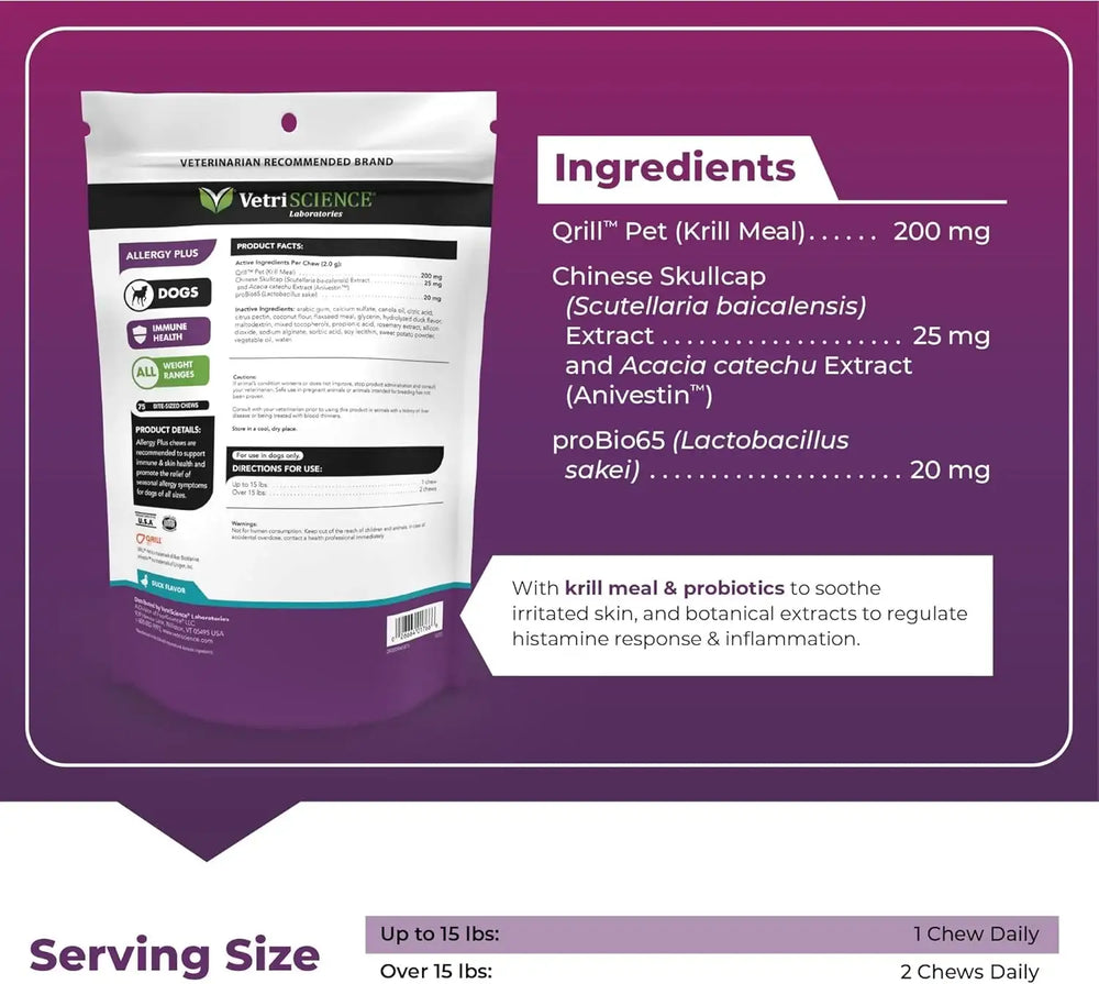 Alivio avanzado para alergias en perros: Ayuda a perros con alergias estacionales y ambientales, aliviando la picazón, el lamido de patas y el enrojecimiento, a la vez que promueve respuestas inmunitarias y antihistamínicas saludables.
