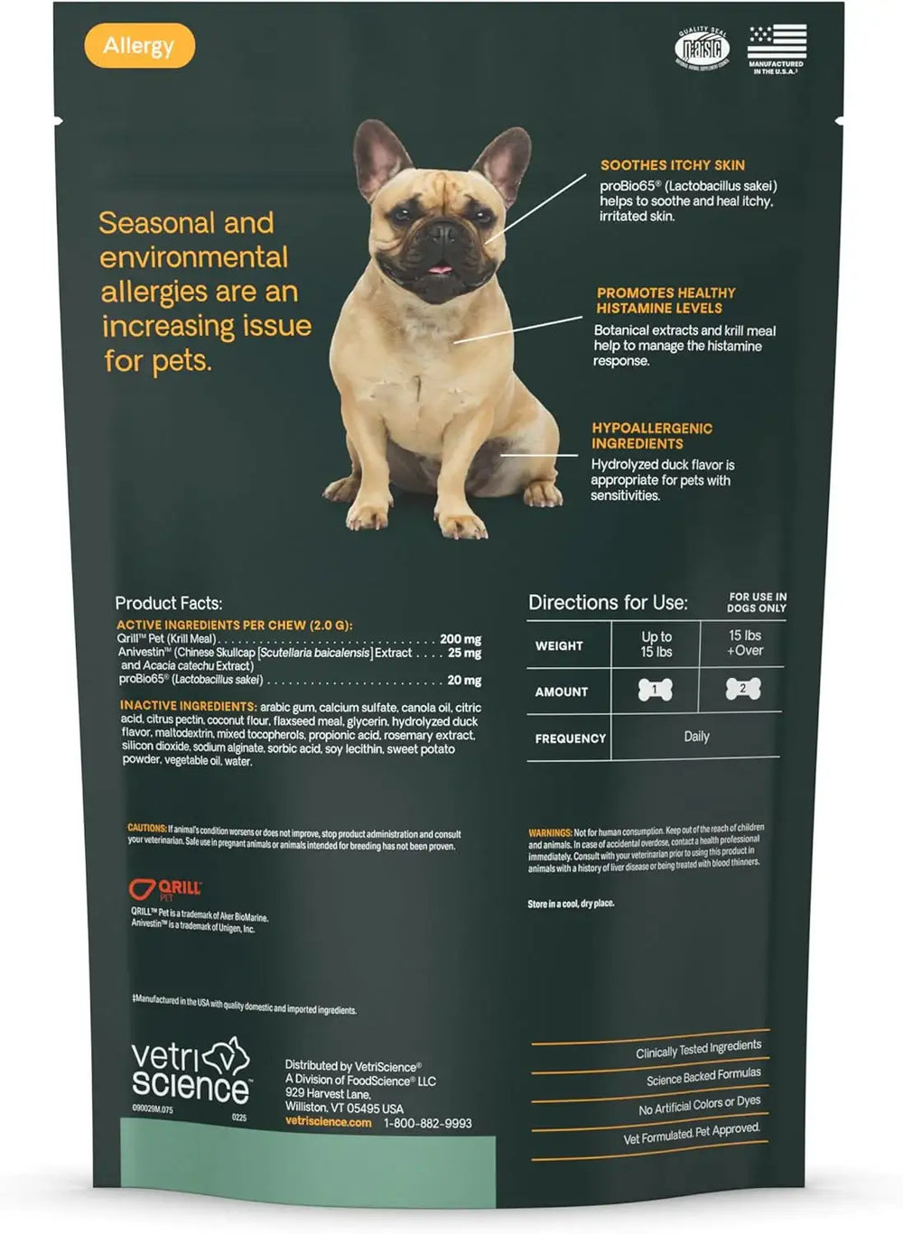 Omega-3 y poder antioxidante: Formulado con harina de krill QRILL Pet, este suplemento para la alergia canina proporciona Omega-3 y astaxantina para promover una piel fuerte y saludable, y calmar la respuesta del sistema inmunitario a los alérgenos.