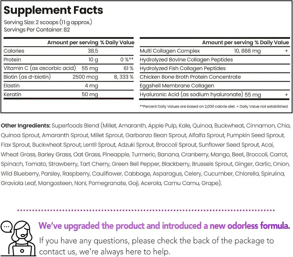 Complejo de colágeno premium: el polvo de péptidos de colágeno multihidrolizado VEV es una combinación premium que proporciona hasta 10 888 mg de péptidos de colágeno premium por porción. Se agrega biotina para garantizar la pureza y la actividad, la absorción efectiva y el apoyo total para la piel, el cabello, las uñas y las articulaciones.