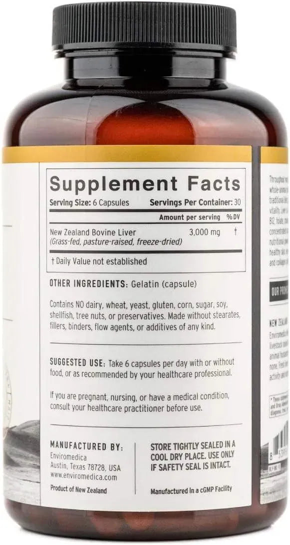 IMPULSA Y LIMPIA EL DESTOXIFICADOR NATURAL DE TU CUERPO: Tu hígado actúa como filtro del cuerpo de toxinas y otros desechos. Rejuvenece, fortalece y limpia el cuerpo con Enviromedica Beef Liver. Elaborado sin estearatos, cargas, aglutinantes, agentes de flujo ni aditivos de ningún tipo. El hígado seco es un multivitamínico totalmente natural, repleto de proteínas, vitamina A, todas las vitaminas B, aminoácidos de espectro completo y minerales clave.
